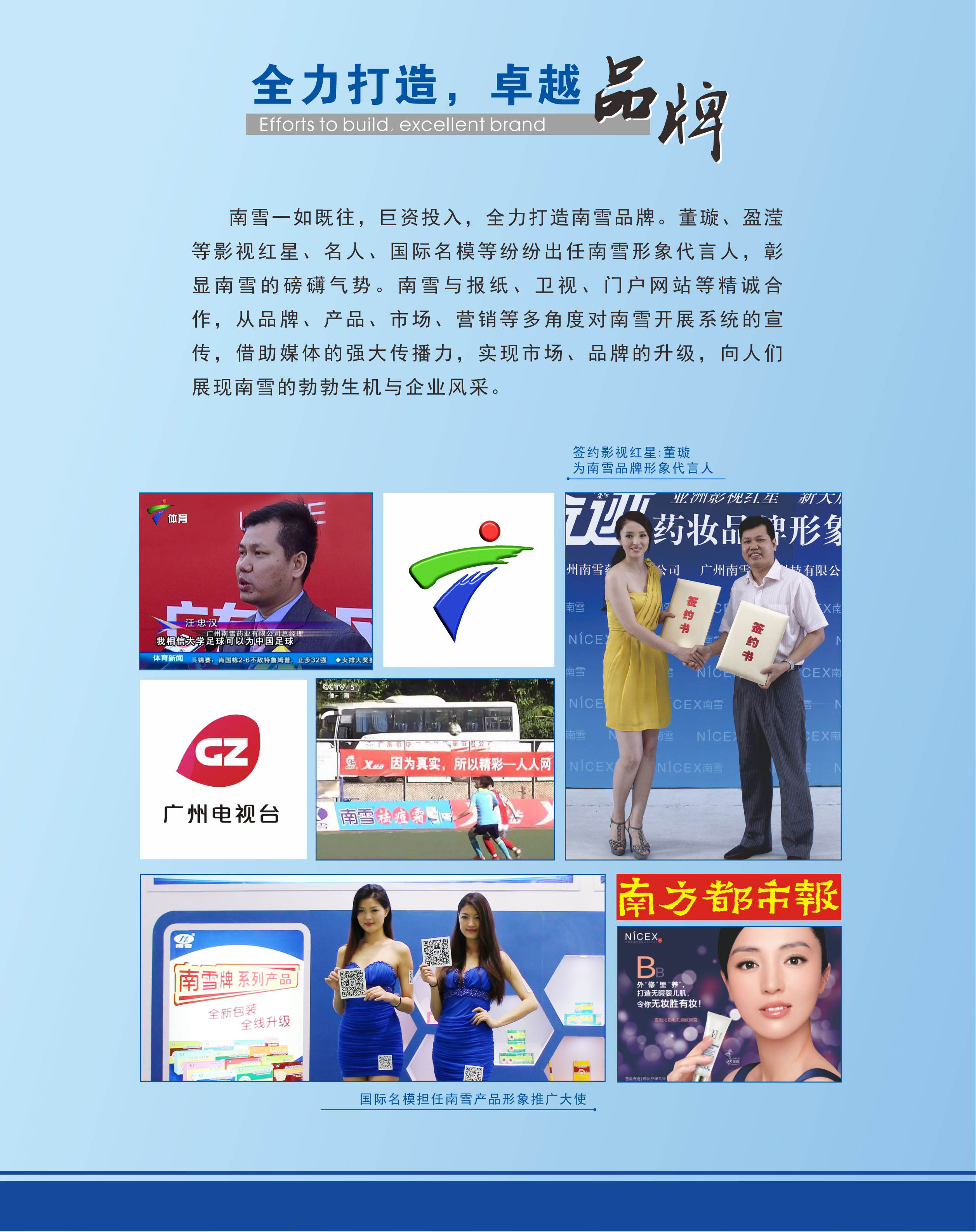 南雪一如既往,巨資投入,全力打造南雪品牌。董璇、盈瀅等影視紅星、名人、國際名模等紛紛出任南雪形象代言人,彰顯南雪的磅礴氣勢。南雪與報(bào)紙、衛(wèi)視、門戶網(wǎng)站等精誠合作,從品牌、產(chǎn)品、市場、營銷等多角度對南雪開展系統(tǒng)的宣傳,借助媒體的強(qiáng)大傳播力,實(shí)現(xiàn)市場、品牌的升級,向人們展現(xiàn)南雪的勃勃生機(jī)與企業(yè)風(fēng)采。